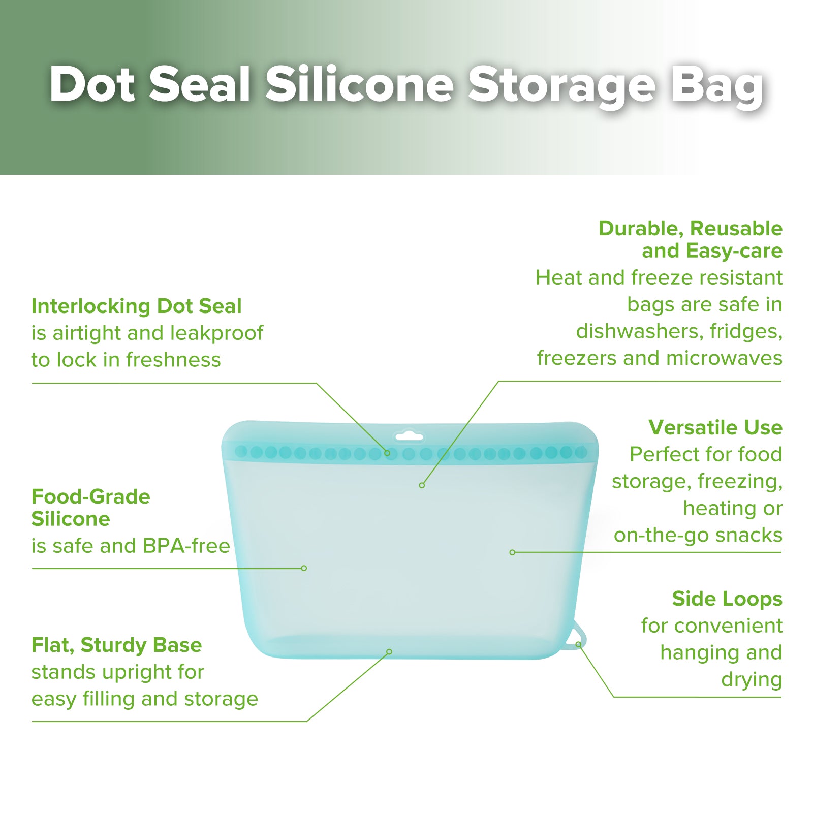 The leak-free Dot Seal closure features interlocking holes and raised ridges that lock in freshness and prevent leaks, even when inverted or squeezed. Bags are microwave and steamer safe—simply pop open a couple of Dot Seals to allow steam to escape when warming food. Wide openings make filling and cleaning easy, while the sturdy base keeps bags upright during use. One side is transparent for quick content checks. Easy to clean and sterilise, these bags are built for long-term everyday use.
