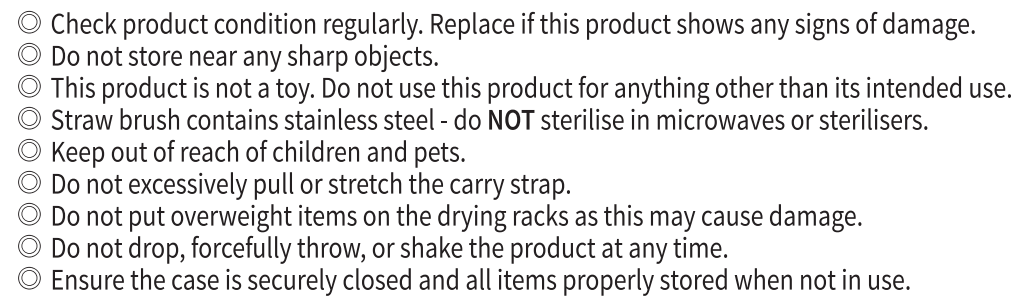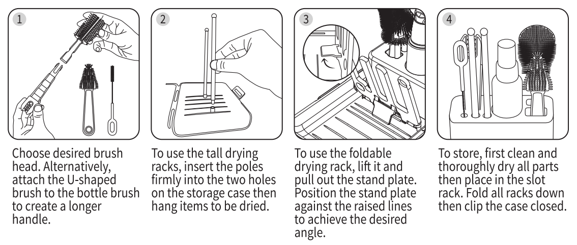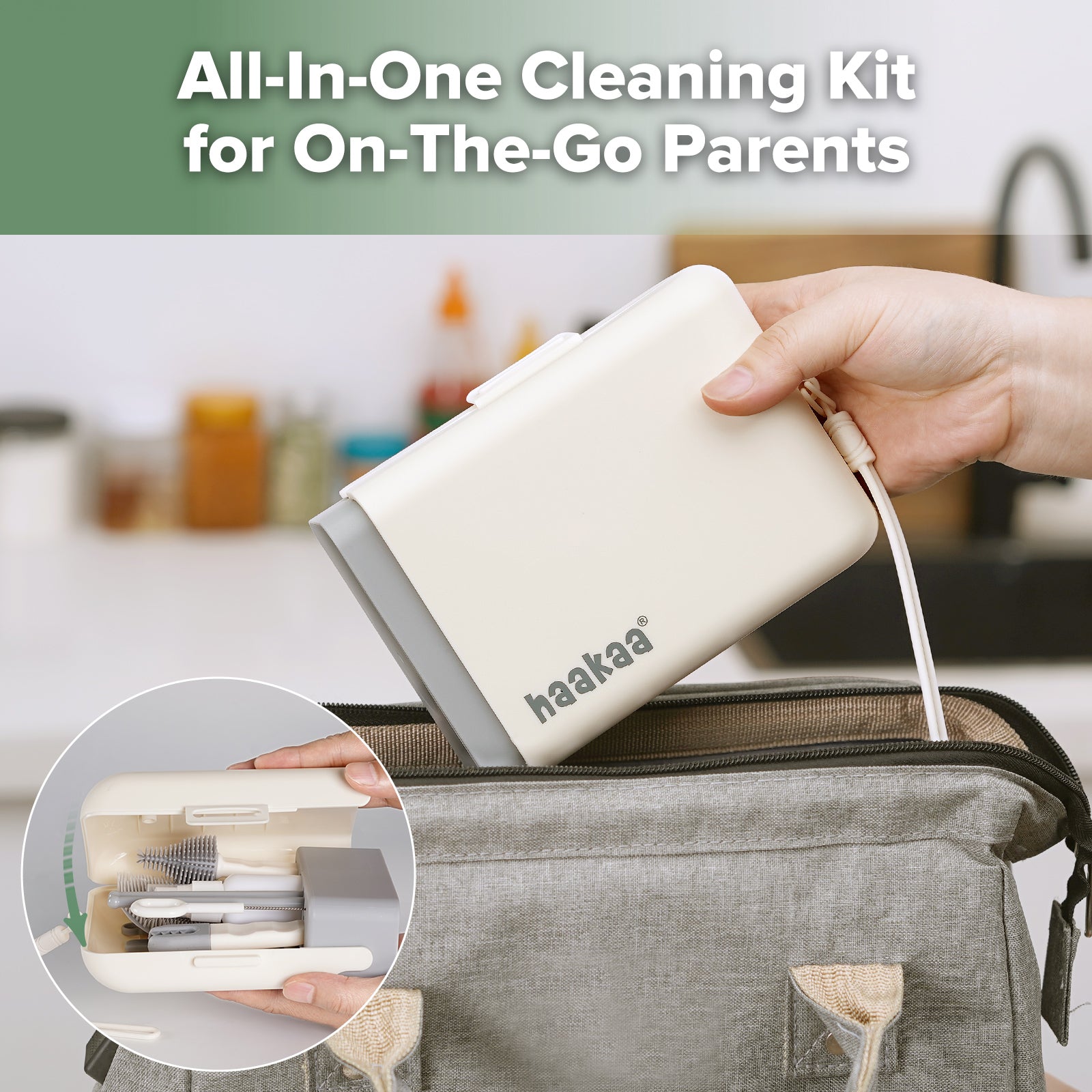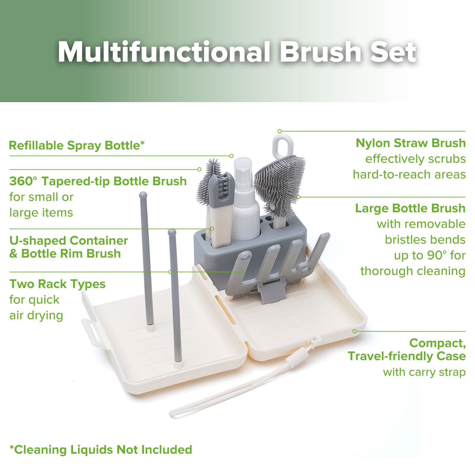 Keep every essential spotless wherever you go with Haakaa's Clean & Dry Travel Brush Set! This all-in-one travel cleaning set is designed to handle daily cleaning tasks, including everything from baby bottles and teats to straws and milk collectors with precision and ease. The bendable bottle brush head flexes for targeted cleaning and features an angled edge to tackle stubborn residue. A 360° brush head with a tapered tip adapts to a variety of sizes, and a simple clip transforms it into a long-handled brush for convenient extended reach. For finer tasks, the nylon straw brush reaches into narrow spots and tight corners, and the dual-direction U-shaped brush fits snugly to the rims of cups or bottles without scratching. Two types of adjustable drying rack allow for effective, efficient air-drying after cleaning. There's even a refillable spray bottle to dispense your chosen cleaning liquids. When you're done, everything folds neatly into the compact, travel-ready case complete with a carry strap for grab-and-go convenience.