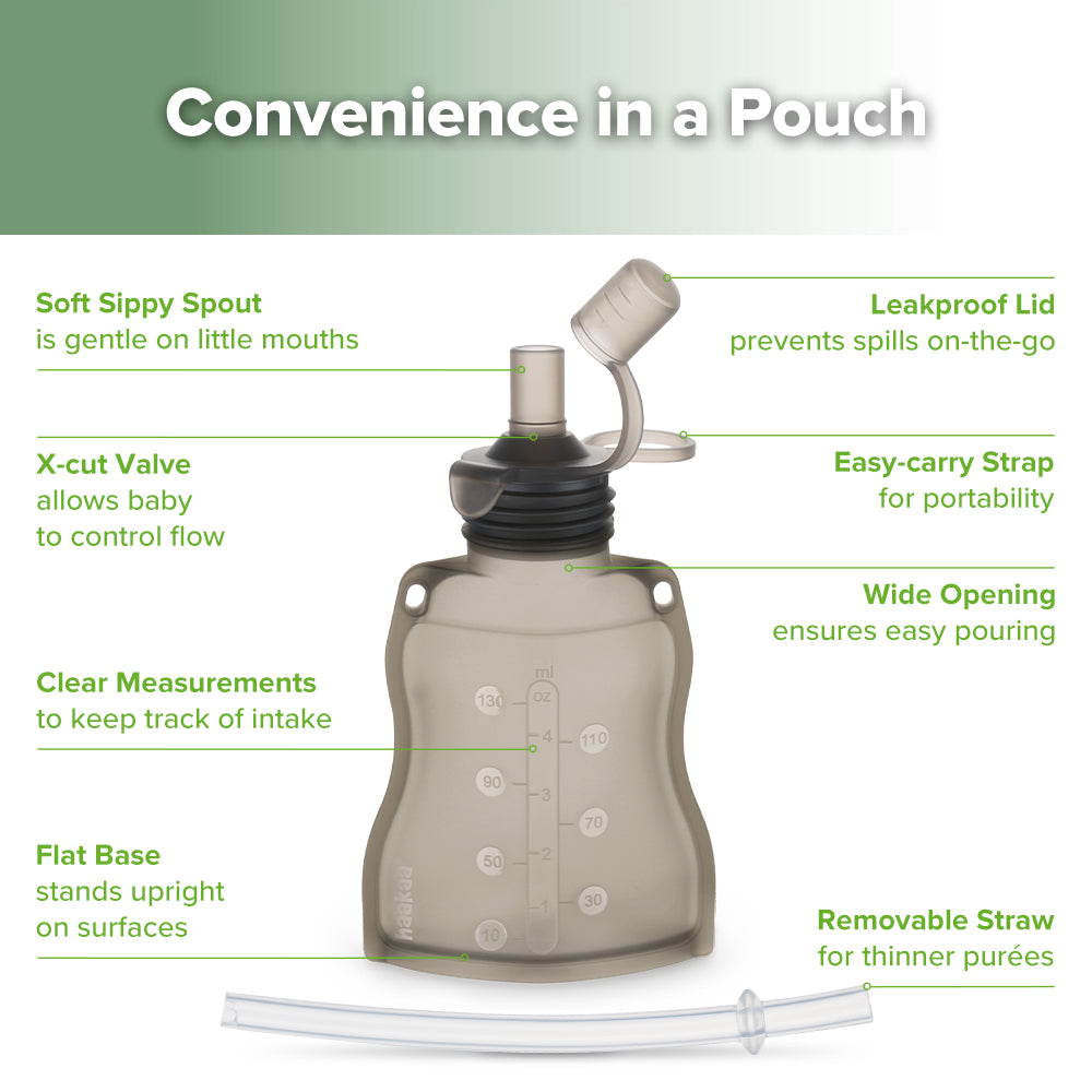 The variable flow opening allows your little one to feed safely and at their own pace, while the optional straw means food is accessible to the last drop. For little hands that are a bit stronger, remove the straw and squeeze or roll up the pouch from the bottom.